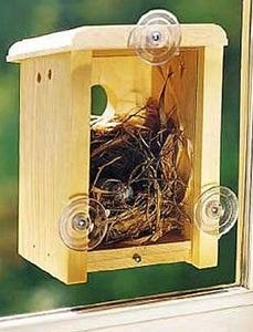 WBU Window Nesting Box: Attach this birdhouse to your window and watch the nesting process from close range. The two suction cups provide for stable mounting. Simply install the house, close the curtains and periodically observe the nest building, egg laying and chick hatching from within your home. The 1¼” diameter entrance hole accommodates House Wrens, chickadees and nuthatches. Dimensions: 9" x 6¼" x 5" House Opening: 1¼” diameter entrance hole